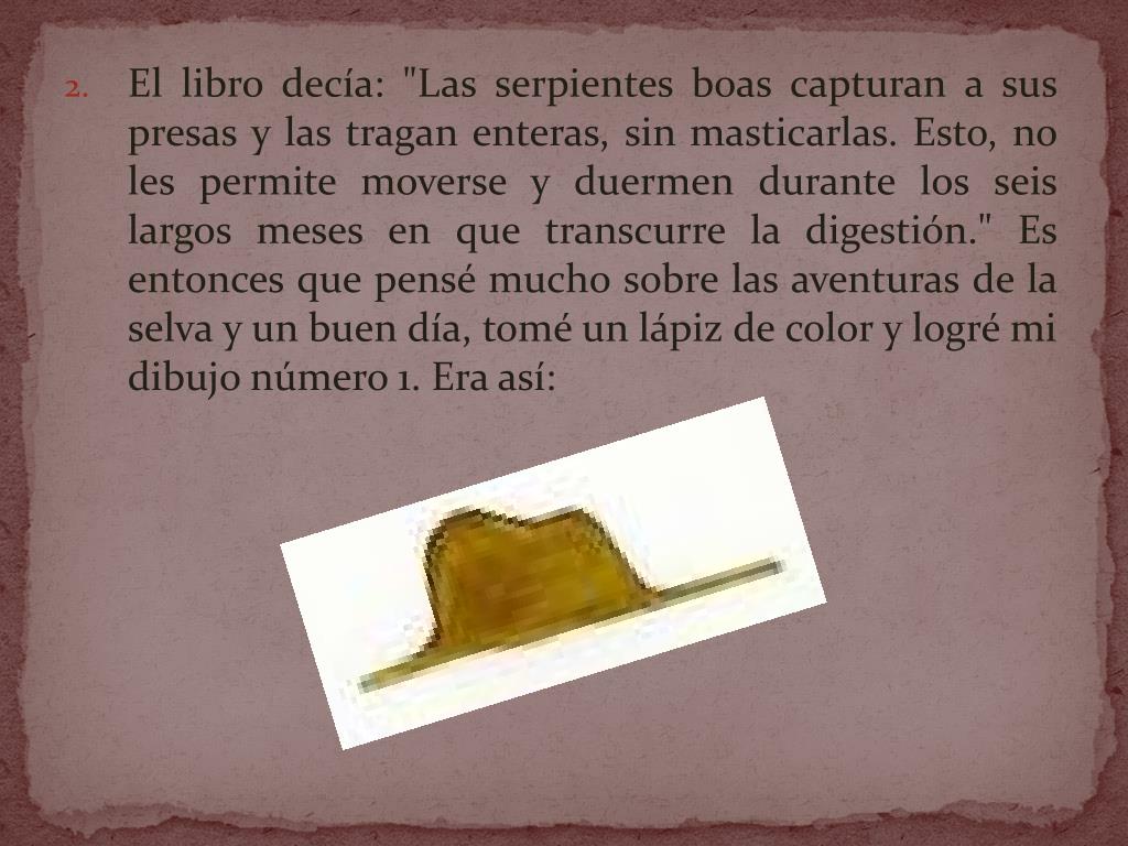 El libro decía: "Las serpientes boas capturan a sus presas y las tragan enteras, sin masticarlas. Esto, no les permite moverse y duermen durante los seis largos meses en que transcurre la digestión." Es entonces que pensé mucho sobre las aventuras de la selva y un buen día, tomé un lápiz de color y logré mi dibujo número 1. Era así: