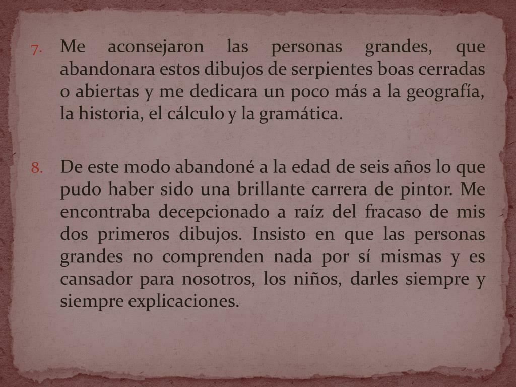 Me aconsejaron las personas grandes, que abandonara estos dibujos de serpientes boas cerradas o abiertas y me dedicara un poco más a la geografía, la historia, el cálculo y la gramática. • De este modo abandoné a la edad de seis años lo que pudo haber sido una brillante carrera de pintor. Me encontraba decepcionado a raíz del fracaso de mis dos primeros dibujos. Insisto en que las personas grandes no comprenden nada por sí mismas y es cansador para nosotros, los niños, darles siempre y siempre explicaciones.