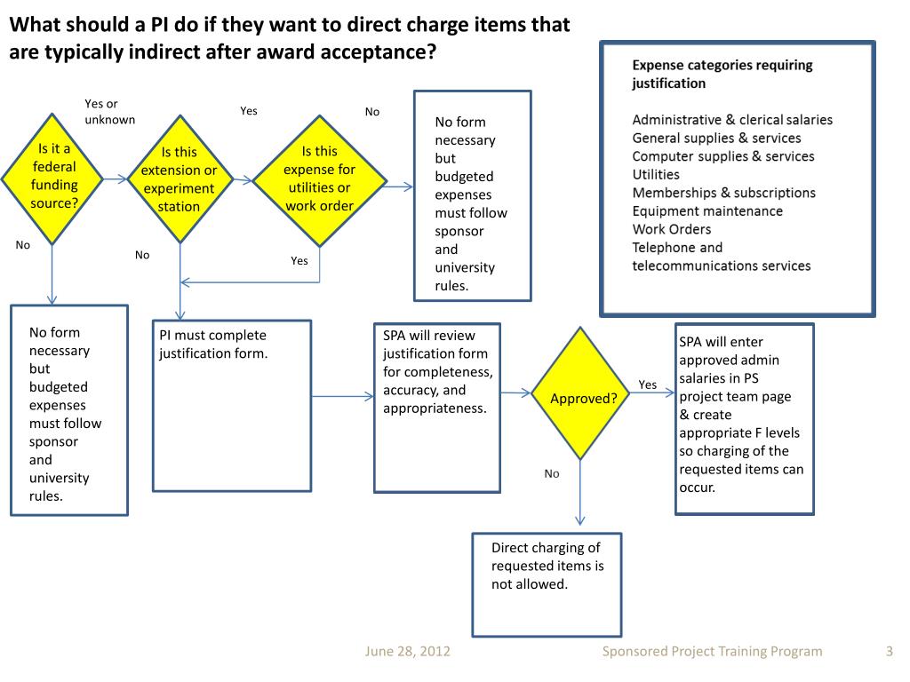 What should a PI do if he/she wants to direct charge items that are typically indirect when an award is processed (for proposals submitted prior to July 1)? PI must complete justification form. Yes Yes or Unknown Yes No form necessary but budgeted expenses must follow sponsor and university rules. Yes Yes Is it a federal funding source? Is this expense for utilities or work order Is this extension or experiment station No No No SPA will review justification form for completeness, accuracy, and appropriateness. SPA will enter approved admin salaries in PS project team page & create appropriate F levels after July 1 so charging of the requested items can occur. No form necessary but budgeted expenses must follow sponsor and university rules. Approved? Direct charging of requested items is not allowed. Sponsored Project Training Program