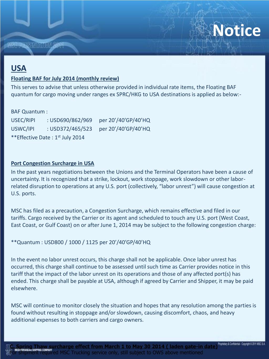 Notice USA Floating BAF for July 2014 (monthly review) This serves to advise that unless otherwise provided in individual rate items, the Floating BAF quantum for cargo moving under ranges ex SPRC/HKG to USA destinations is applied as below:- BAF Quantum : USEC/RIPI : USD690/862/969 per 20’/40’GP/40’HQ USWC/IPI : USD372/465/523 per 20’/40’GP/40’HQ **Effective Date : 1st July 2014 Port Congestion Surcharge in USA In the past years negotiations between the Unions and the Terminal Operators have been a cause of uncertainty. It is recognized that a strike, lockout, work stoppage, work slowdown or other labor-related disruption to operations at any U.S. port (collectively, “labor unrest”) will cause congestion at U.S. ports. MSC has filed as a precaution, a Congestion Surcharge, which remains effective and filed in our tariffs. Cargo received by the Carrier or its agent and scheduled to touch any U.S. port (West Coast, East Coast, or Gulf Coast) on or after June 1, 2014 may be subject to the following congestion charge: **Quantum : USD800 / 1000 / 1125 per 20’/40’GP/40’HQ In the event no labor unrest occurs, this charge shall not be applicable. Once labor unrest has occurred, this charge shall continue to be assessed until such time as Carrier provides notice in this tariff that the impact of the labor unrest on its operations and those of any affected port(s) has ended. This charge shall be payable at USA, although if agreed by Carrier and Shipper, it may be paid elsewhere. MSC will continue to monitor closely the situation and hopes that any resolution among the parties is found without resulting in stoppage and/or slowdown, causing discomfort, chaos, and heavy additional expenses to both carriers and cargo owners. C. Spring Thaw surcharge effect from March 1 to May 30 2014 ( laden gate-in date) For shipment required MSC Trucking service only, still subject to OWS above mentioned
