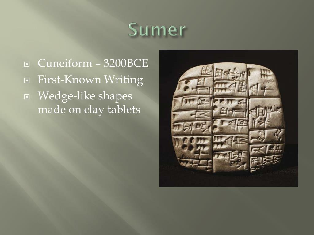 Sumer • Cuneiform – 3200BCE • First-Known Writing • Wedge-like shapes made on clay tablets
