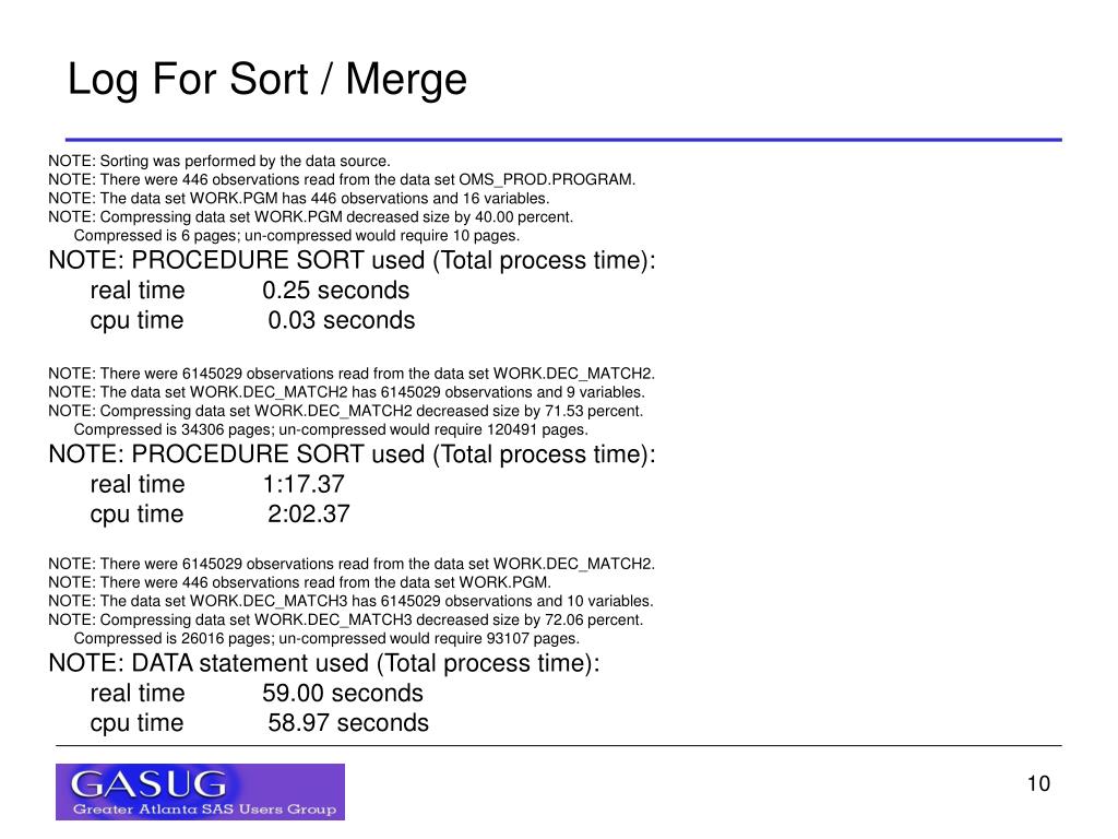 Log For Sort / Merge NOTE: Sorting was performed by the data source. NOTE: There were 446 observations read from the data set OMS_PROD.PROGRAM. NOTE: The data set WORK.PGM has 446 observations and 16 variables. NOTE: Compressing data set WORK.PGM decreased size by 40.00 percent. Compressed is 6 pages; un-compressed would require 10 pages. NOTE: PROCEDURE SORT used (Total process time): real time 0.25 seconds cpu time 0.03 seconds NOTE: There were 6145029 observations read from the data set WORK.DEC_MATCH2. NOTE: The data set WORK.DEC_MATCH2 has 6145029 observations and 9 variables. NOTE: Compressing data set WORK.DEC_MATCH2 decreased size by 71.53 percent. Compressed is 34306 pages; un-compressed would require 120491 pages. NOTE: PROCEDURE SORT used (Total process time): real time 1:17.37 cpu time 2:02.37 NOTE: There were 6145029 observations read from the data set WORK.DEC_MATCH2. NOTE: There were 446 observations read from the data set WORK.PGM. NOTE: The data set WORK.DEC_MATCH3 has 6145029 observations and 10 variables. NOTE: Compressing data set WORK.DEC_MATCH3 decreased size by 72.06 percent. Compressed is 26016 pages; un-compressed would require 93107 pages. NOTE: DATA statement used (Total process time): real time 59.00 seconds cpu time 58.97 seconds