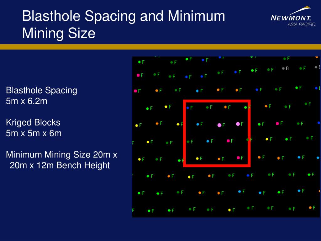 Blasthole Spacing and Minimum Mining Size • Blasthole Spacing • 5m x 6.2m • Kriged Blocks • 5m x 5m x 6m • Minimum Mining Size 20m x 20m x 12m Bench Height Place title of presentation here