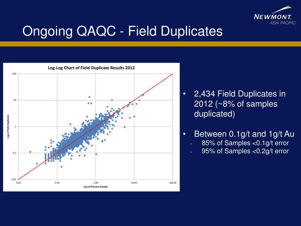 Ongoing QAQC - Field Duplicates • Text starts here, Arial 20pt. • Level 2, Arial 20pt • Level 3, Arial 14pt • Level 4, Arial 14pt • Level 5, Arial 14pt • 2,434 Field Duplicates in 2012 (~8% of samples duplicated) • Between 0.1g/t and 1g/t Au • 85% of Samples <0.1g/t error • 95% of Samples <0.2g/t error If notes are needed they are Arial 10pt. Place title of presentation here