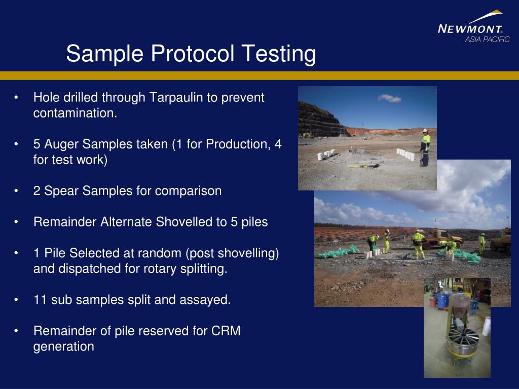Sample Protocol Testing • Hole drilled through Tarpaulin to prevent contamination. • 5 Auger Samples taken (1 for Production, 4 for test work) • 2 Spear Samples for comparison • Remainder Alternate Shovelled to 5 piles • 1 Pile Selected at random (post shovelling) and dispatched for rotary splitting. • 11 sub samples split and assayed. • Remainder of pile reserved for CRM generation Place title of presentation here
