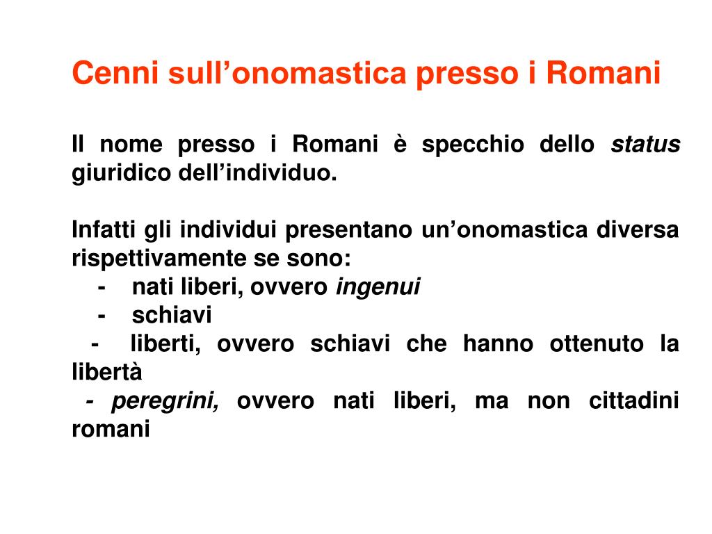 Cenni sull’onomastica presso i Romani Il nome presso i Romani è specchio dello status giuridico dell’individuo. Infatti gli individui presentano un’onomastica diversa rispettivamente se sono: - nati liberi, ovvero ingenui - schiavi