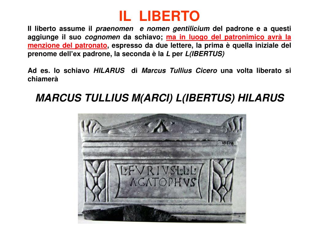 IL LIBERTO Il liberto assume il praenomen e nomengentiliciumdel padrone e a questi aggiunge il suo cognomen da schiavo; ma in luogo del patronimico avrà la menzione del patronato, espresso da due lettere, la prima è quella iniziale del prenome dell’ex padrone, la seconda è la L per L(IBERTUS) Ad es. lo schiavo HILARUS di Marcus Tullius Cicero una volta liberato si chiamerà MARCUS TULLIUS M(ARCI) L(IBERTUS) HILARUS
