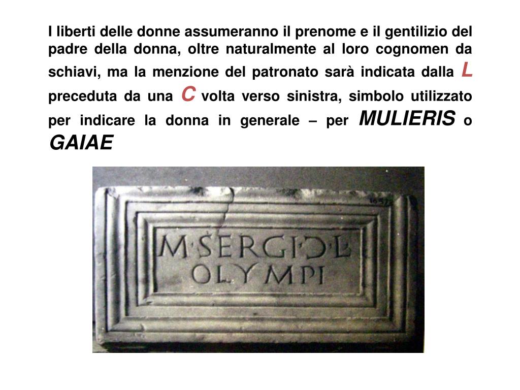 I liberti delle donne assumeranno il prenome e il gentilizio del padre della donna, oltre naturalmente al loro cognomen da schiavi, ma la menzione del patronato sarà indicata dalla Lpreceduta da una C volta verso sinistra, simbolo utilizzato per indicare la donna in generale – per MULIERIS o GAIAE