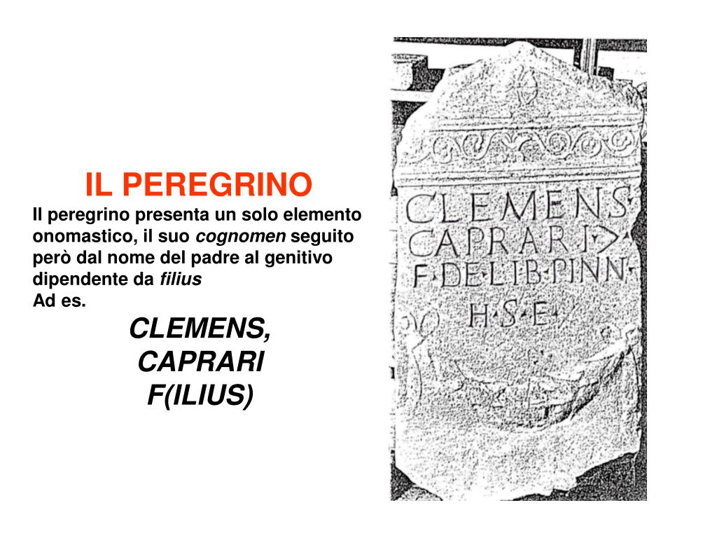 IL PEREGRINO Il peregrino presenta un solo elemento onomastico, il suo cognomenseguito però dal nome del padre al genitivo dipendente da filius Ad es. CLEMENS, CAPRARI F(ILIUS)