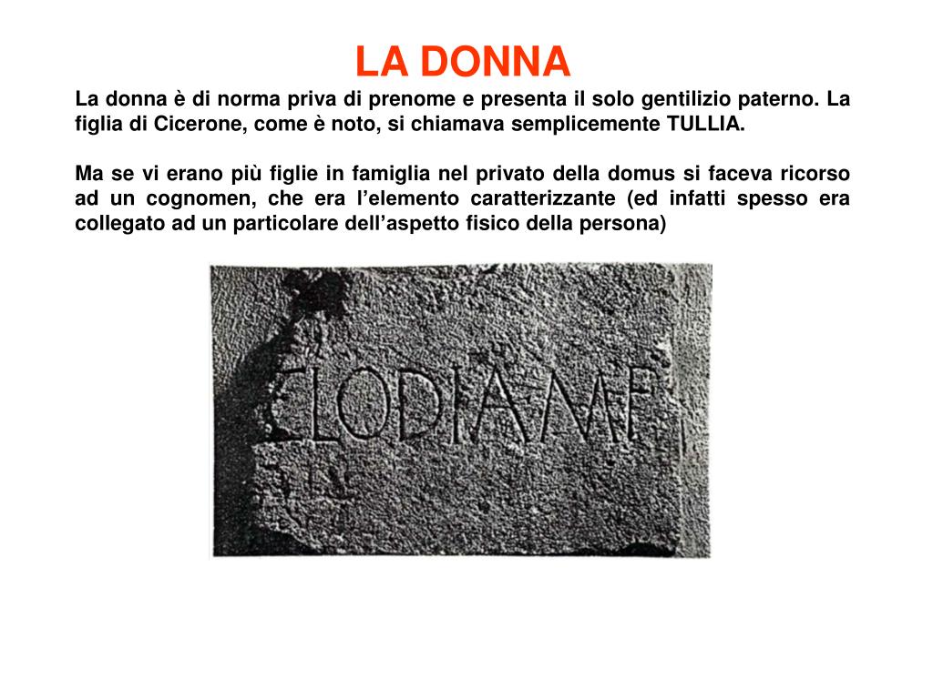 LA DONNA La donna è di norma priva di prenome e presenta il solo gentilizio paterno. La figlia di Cicerone, come è noto, si chiamava semplicemente TULLIA. Ma se vi erano più figlie in famiglia nel privato della domus si faceva ricorso ad un cognomen, che era l’elemento caratterizzante (ed infatti spesso era collegato ad un particolare dell’aspetto fisico della persona)