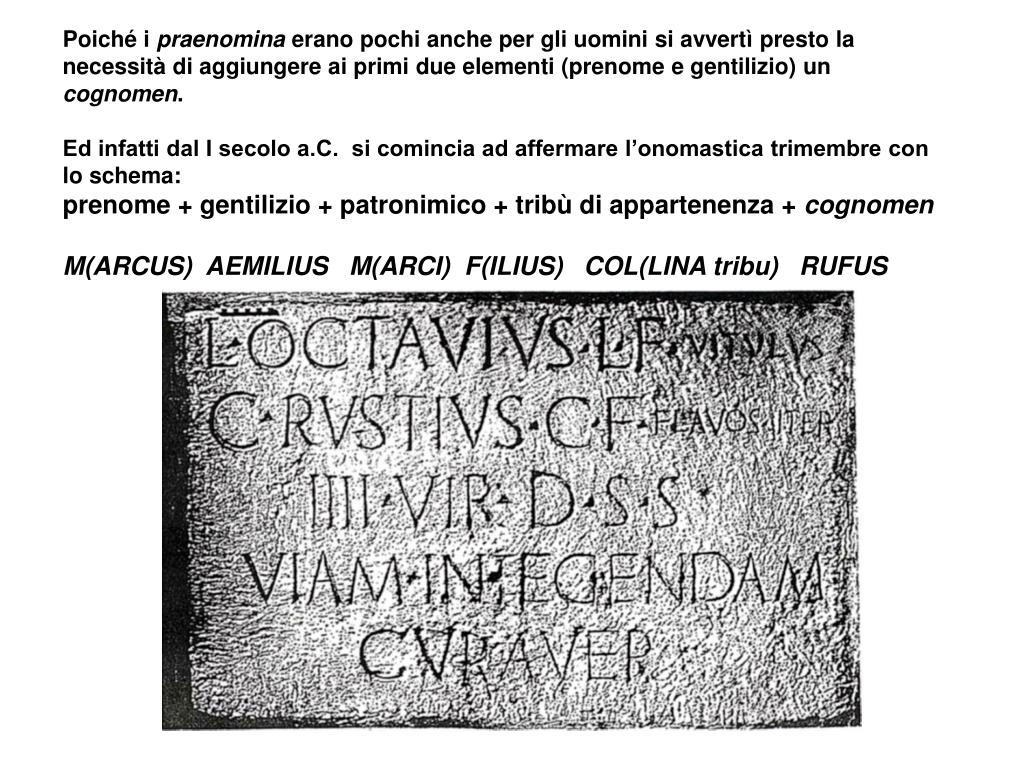 Ben presto al prenome venne aggiunto il nomengentiliciume a seguire il patronimico, che nelle iscrizioni vediamo abbreviato in due lettere, la prima è quella iniziale del prenome del padre, la seconda è la F iniziale di FILIUS ; • e spesso segue anche la tribù di appartenenza