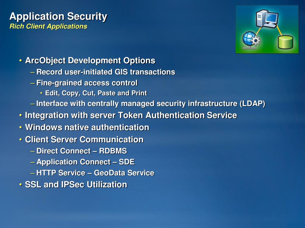 Application SecurityRich Client Applications • ArcObject Development Options • Record user-initiated GIS transactions • Fine-grained access control • Edit, Copy, Cut, Paste and Print • Interface with centrally managed security infrastructure (LDAP) • Integration with server Token Authentication Service • Windows native authentication • Client Server Communication • Direct Connect – RDBMS • Application Connect – SDE • HTTP Service – GeoData Service • SSL and IPSec Utilization