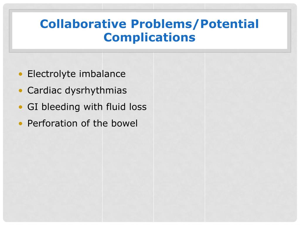 Collaborative Problems/Potential Complications • Electrolyte imbalance • Cardiac dysrhythmias • GI bleeding with fluid loss • Perforation of the bowel