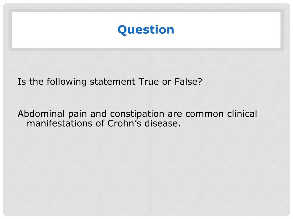 Question Is the following statement True or False? Abdominal pain and constipation are common clinical manifestations of Crohn’s disease.