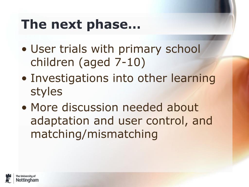 The next phase… • User trials with primary school children (aged 7-10) • Investigations into other learning styles • More discussion needed about adaptation and user control, and matching/mismatching