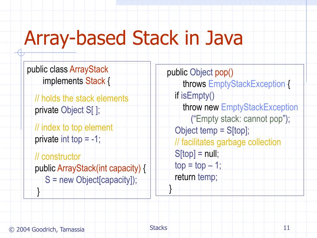 Array-based Stack in Java public classArrayStackimplements Stack{ // holds the stack elementsprivate Object S[ ]; // index to top elementprivate int top = -1; // constructorpublicArrayStack(int capacity){S = new Object[capacity]);} public Object pop()throwsEmptyStackException{if isEmpty()throw newEmptyStackException(“Empty stack: cannot pop”);Object temp = S[top];// facilitates garbage collection S[top] =null; top = top – 1;returntemp;} Stacks