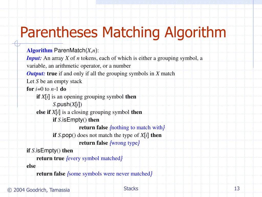 Parentheses Matching Algorithm Algorithm ParenMatch(X,n): Input: An array X of n tokens, each of which is either a grouping symbol, a variable, an arithmetic operator, or a number Output: true if and only if all the grouping symbols in X match Let S be an empty stack for i=0 to n-1 do if X[i] is an opening grouping symbol then S.push(X[i]) else if X[i] is a closing grouping symbol then if S.isEmpty() then return false {nothing to match with} if S.pop() does not match the type of X[i] then return false {wrong type} if S.isEmpty() then return true {every symbol matched} else return false {some symbols were never matched} Stacks