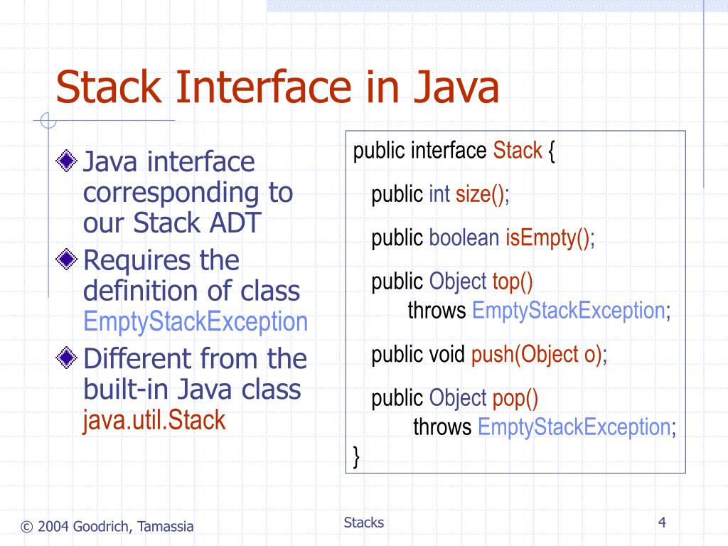 Stack Interface in Java public interfaceStack{ public int size(); public boolean isEmpty(); public Object top()throwsEmptyStackException; public voidpush(Object o); public Object pop()throwsEmptyStackException;} • Java interface corresponding to our Stack ADT • Requires the definition of class EmptyStackException • Different from the built-in Java class java.util.Stack Stacks