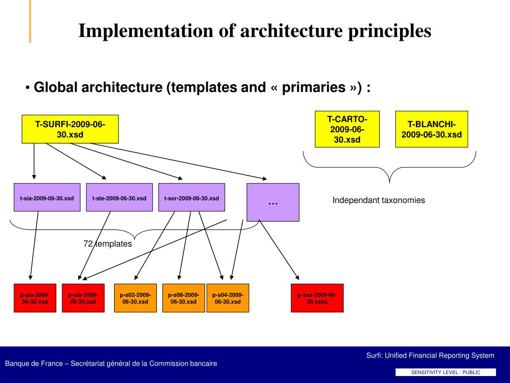 Implementation of architecture principles • Global architecture (templates and « primaries ») : T-CARTO-2009-06-30.xsd T-BLANCHI-2009-06-30.xsd T-SURFI-2009-06-30.xsd t-sia-2009-06-30.xsd t-ste-2009-06-30.xsd t-sor-2009-06-30.xsd … Independant taxonomies 72 templates p-sia-2009-06-30.xsd p-ste-2009-06-30.xsd p-s02-2009-06-30.xsd p-s08-2009-06-30.xsd p-s04-2009-06-30.xsd p-sxx-2009-06-30.xsds