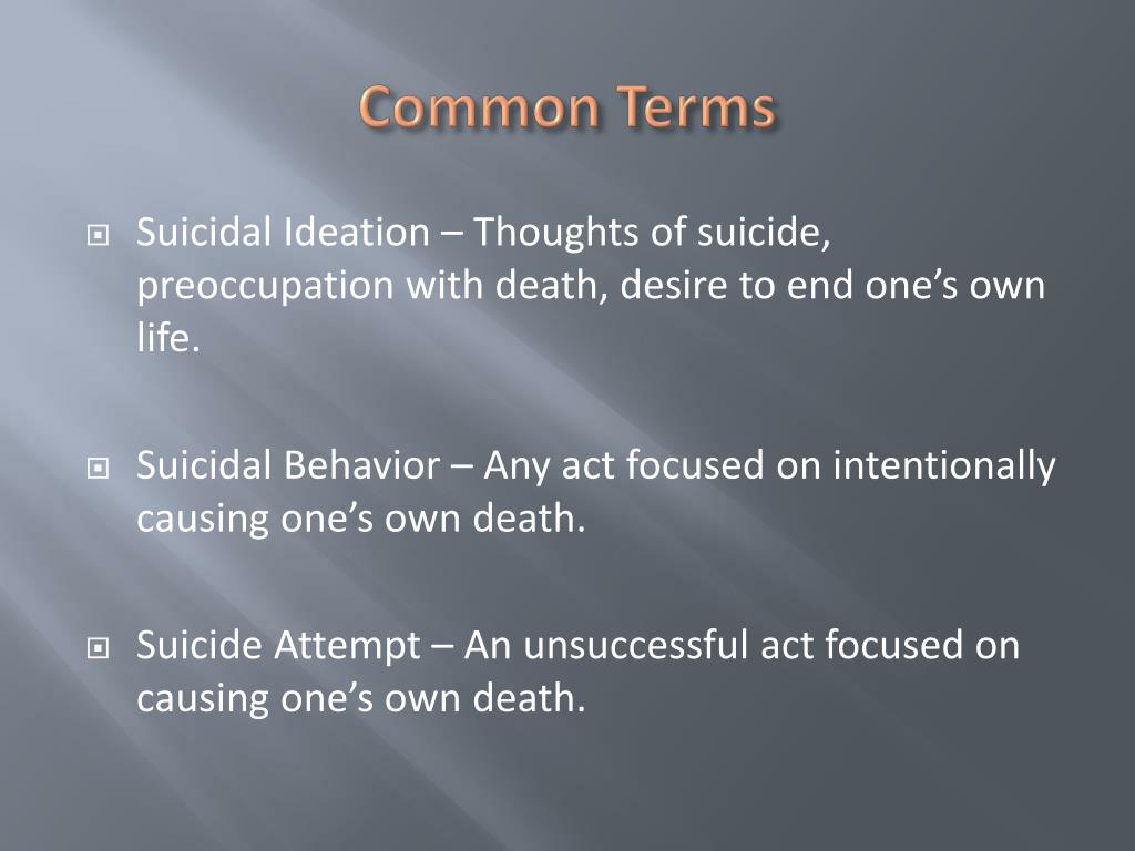Common Terms • Suicidal Ideation – Thoughts of suicide, preoccupation with death, desire to end one’s own life. • Suicidal Behavior – Any act focused on intentionally causing one’s own death. • Suicide Attempt – An unsuccessful act focused on causing one’s own death.