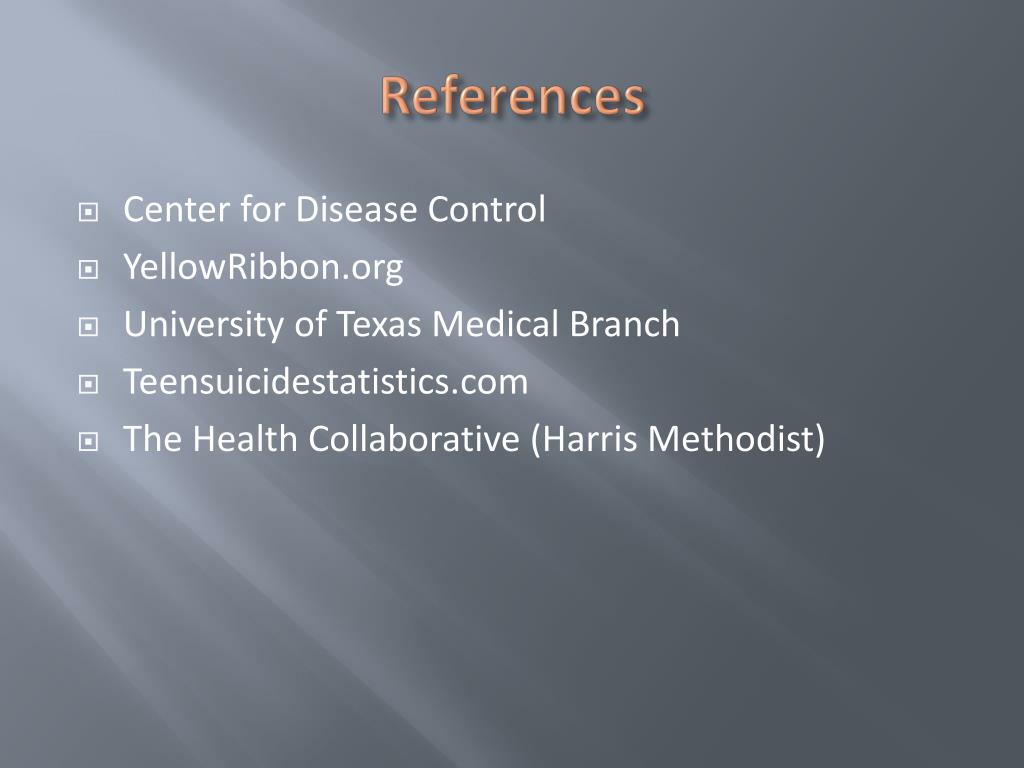 References • Center for Disease Control • YellowRibbon.org • University of Texas Medical Branch • Teensuicidestatistics.com • The Health Collaborative (Harris Methodist)