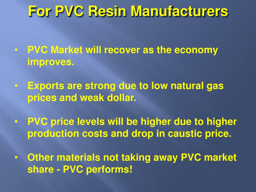 For PVC Resin Manufacturers • PVC Market will recover as the economy improves. • Exports are strong due to low natural gas prices and weak dollar. • PVC price levels will be higher due to higher production costs and drop in caustic price. • Other materials not taking away PVC market share - PVC performs!