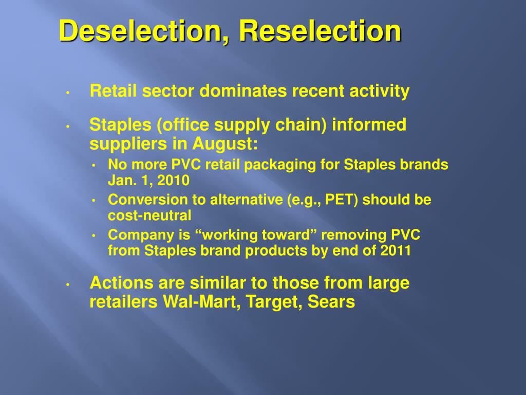 Deselection, Reselection • Retail sector dominates recent activity • Staples (office supply chain) informed suppliers in August: • No more PVC retail packaging for Staples brands Jan. 1, 2010 • Conversion to alternative (e.g., PET) should be cost-neutral • Company is “working toward” removing PVC from Staples brand products by end of 2011 • Actions are similar to those from large retailers Wal-Mart, Target, Sears