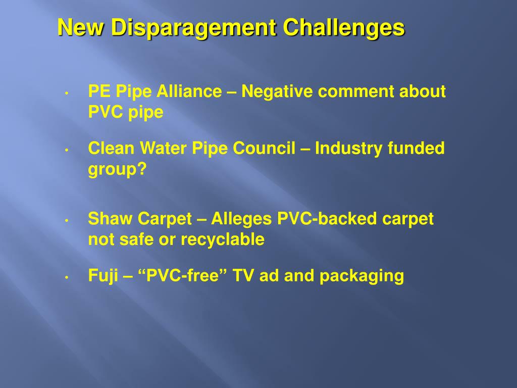 New Disparagement Challenges • PE Pipe Alliance – Negative comment about PVC pipe • Clean Water Pipe Council – Industry funded group? • Shaw Carpet – Alleges PVC-backed carpet not safe or recyclable • Fuji – “PVC-free” TV ad and packaging