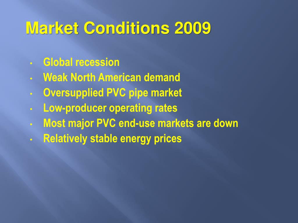 Market Conditions 2009 • Global recession • Weak North American demand • Oversupplied PVC pipe market • Low-producer operating rates • Most major PVC end-use markets are down • Relatively stable energy prices