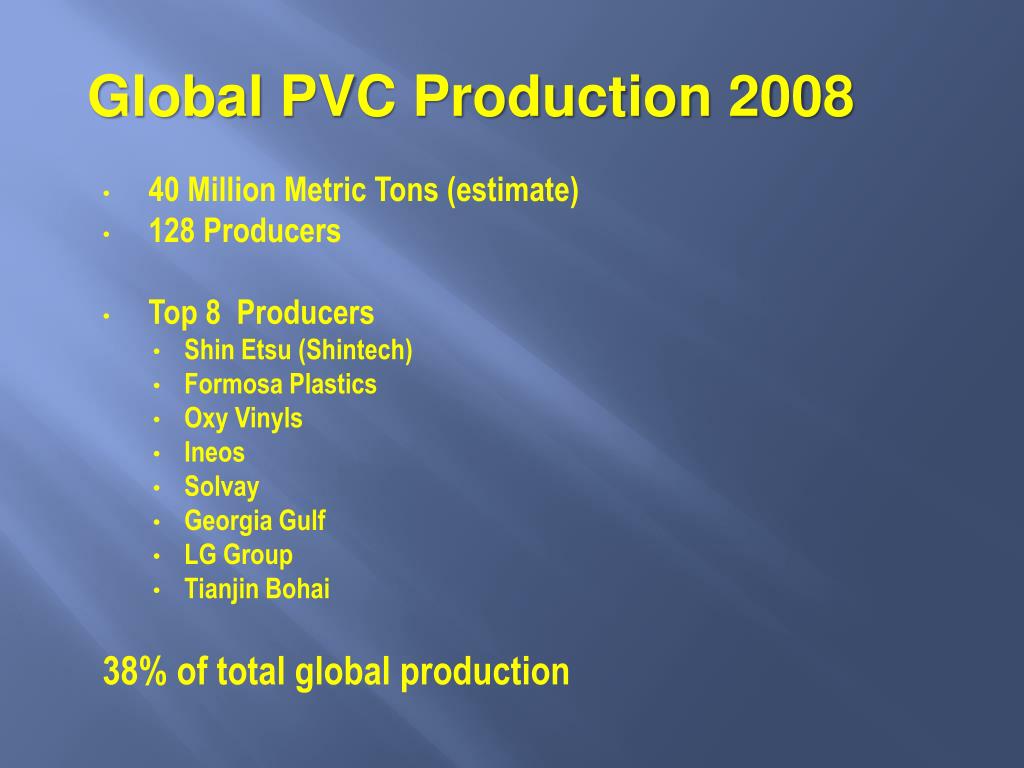 Global PVC Production 2008 • 40 Million Metric Tons (estimate) • 128 Producers • Top 8 Producers • Shin Etsu (Shintech) • Formosa Plastics • Oxy Vinyls • Ineos • Solvay • Georgia Gulf • LG Group • Tianjin Bohai 38% of total global production