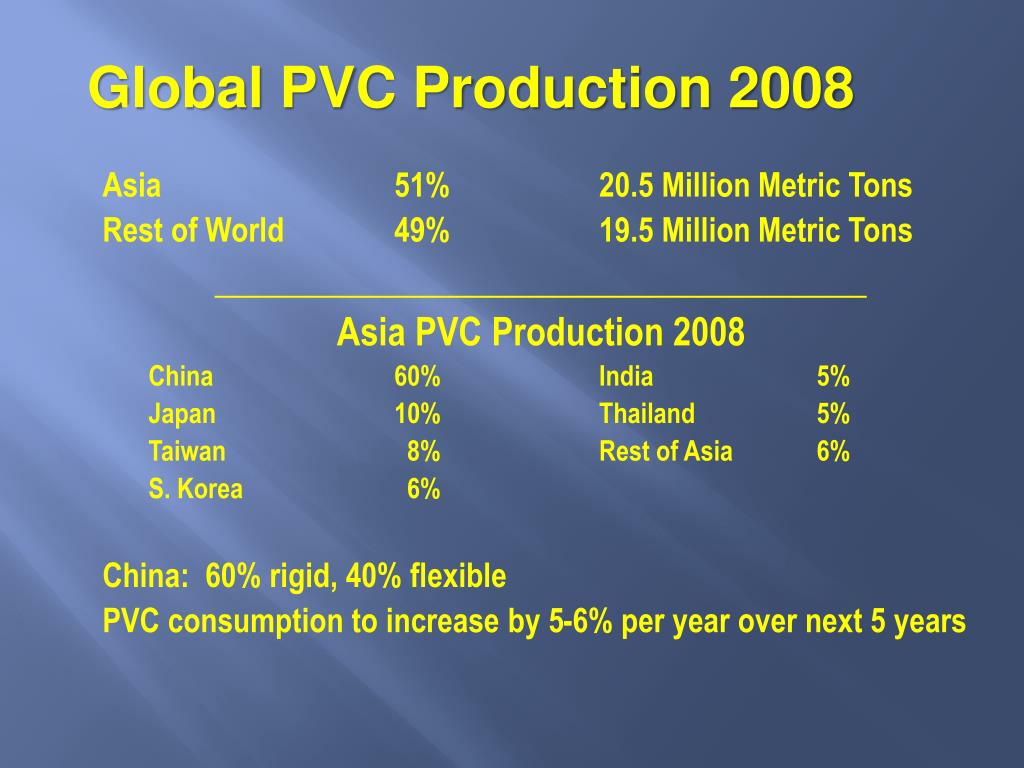 Global PVC Production 2008 Asia 51% 20.5 Million Metric Tons Rest of World 49% 19.5 Million Metric Tons ____________________________________ Asia PVC Production 2008 China 60% India 5% Japan 10% Thailand 5% Taiwan 8% Rest of Asia 6% S. Korea 6% China: 60% rigid, 40% flexible PVC consumption to increase by 5-6% per year over next 5 years