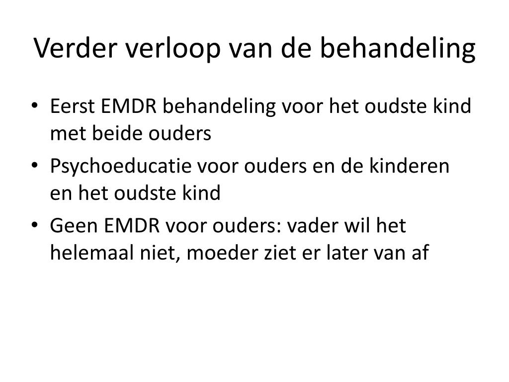Verder verloop van de behandeling • Eerst EMDR behandeling voor het oudste kind met beide ouders • Psychoeducatie voor ouders en de kinderen en het oudste kind • Geen EMDR voor ouders: vader wil het helemaal niet, moeder ziet er later van af