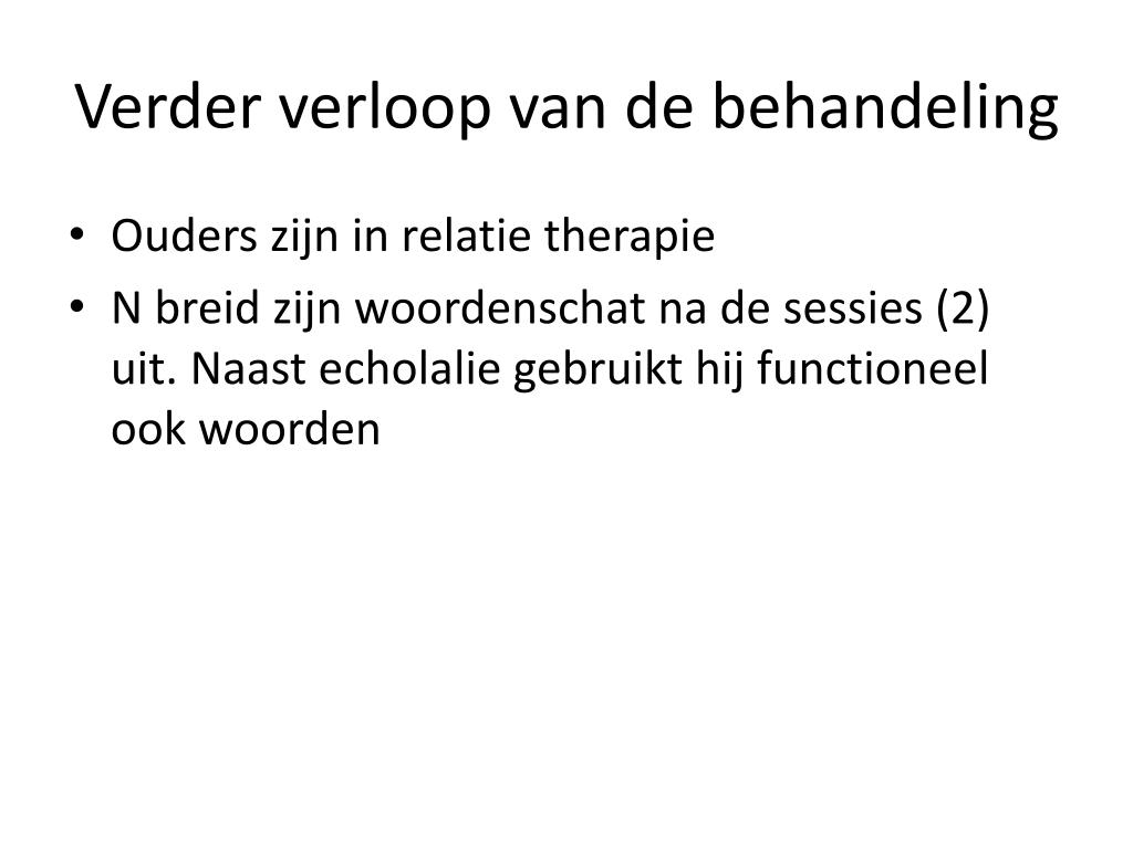 Verder verloop van de behandeling • Ouders zijn in relatie therapie • N breid zijn woordenschat na de sessies (2) uit. Naast echolalie gebruikt hij functioneel ook woorden