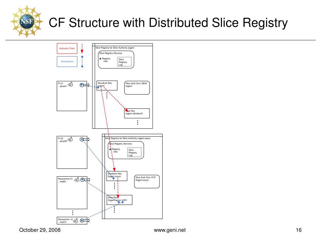 Current CF-HLD Differences • Difference 4: Current CF implementations have clearinghouse registries (and related authority services) that vary: • From centralized to distributed. • With different arrangements of registries and related authority services. • How can one CF-HLD accommodate them all? • Ongoing discussions with each CF project to resolve. www.geni.net