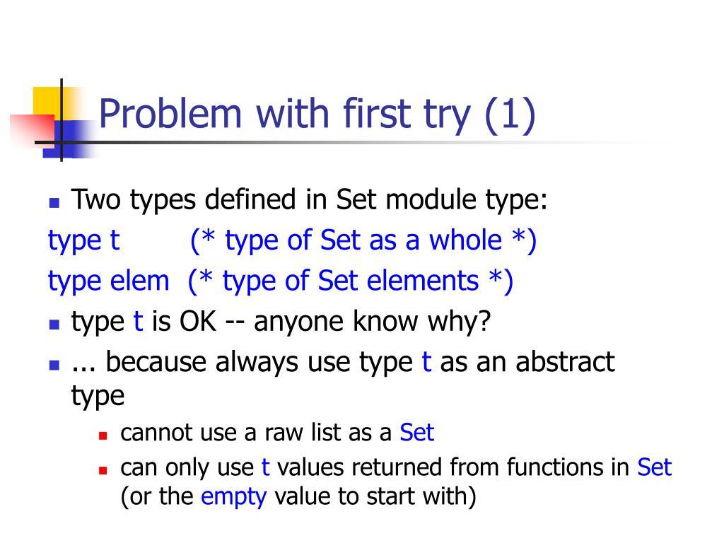 Problem with first try (1) • Two types defined in Set module type: type t (* type of Set as a whole *) type elem (* type of Set elements *) • type t is OK -- anyone know why? • ... because always use type t as an abstract type • cannot use a raw list as a Set • can only use t values returned from functions in Set (or the empty value to start with)