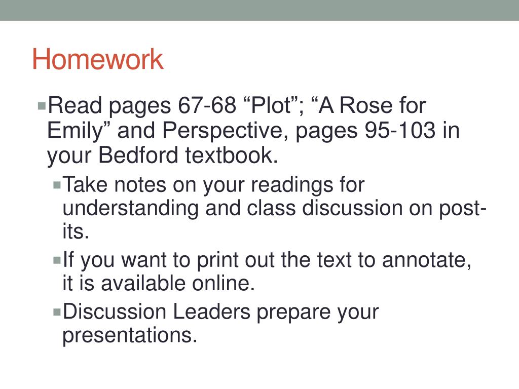 Homework • Read pages 67-68 “Plot”; “A Rose for Emily” and Perspective, pages 95-103 in your Bedford textbook. • Take notes on your readings for understanding and class discussion on post-its. • If you want to print out the text to annotate, it is available online. • Discussion Leaders prepare your presentations.