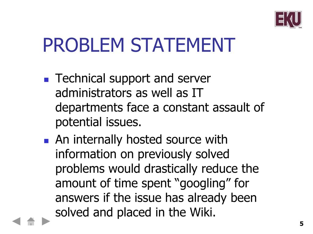 PROBLEM STATEMENT • Technical support and server administrators as well as IT departments face a constant assault of potential issues. • An internally hosted source with information on previously solved problems would drastically reduce the amount of time spent “googling” for answers if the issue has already been solved and placed in the Wiki.