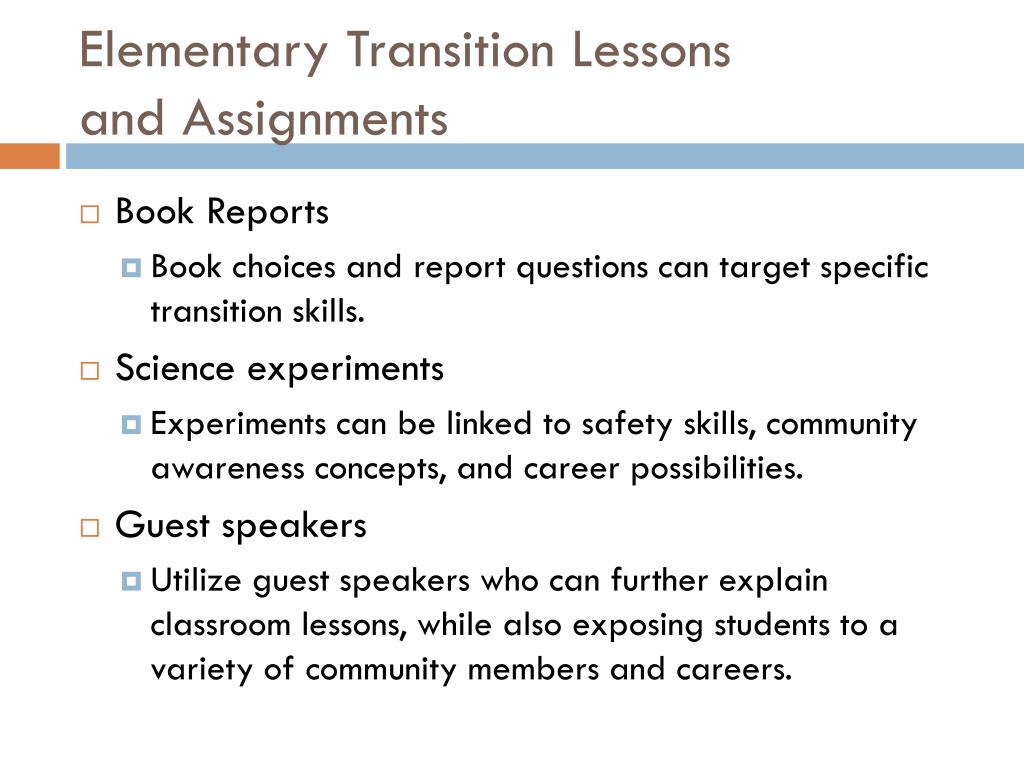 Elementary Transition Lessons and Assignments • Book Reports • Book choices and report questions can target specific transition skills. • Science experiments • Experiments can be linked to safety skills, community awareness concepts, and career possibilities. • Guest speakers • Utilize guest speakers who can further explain classroom lessons, while also exposing students to a variety of community members and careers.