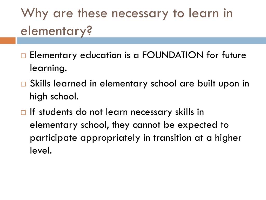 Why are these necessary to learn in elementary? • Elementary education is a FOUNDATION for future learning. • Skills learned in elementary school are built upon in high school. • If students do not learn necessary skills in elementary school, they cannot be expected to participate appropriately in transition at a higher level.