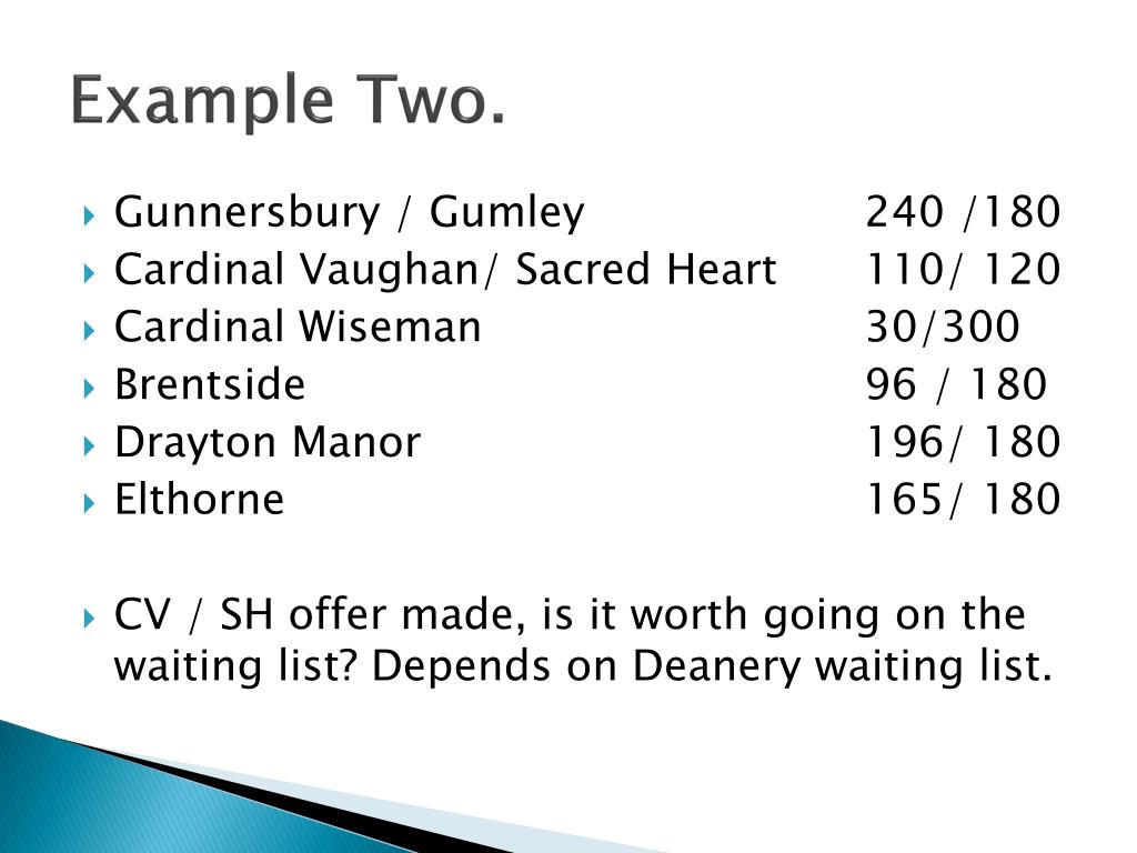 Example Two. • Gunnersbury / Gumley 240 /180 • Cardinal Vaughan/ Sacred Heart 110/ 120 • Cardinal Wiseman 30/300 • Brentside 96 / 180 • Drayton Manor 196/ 180 • Elthorne 165/ 180 • CV / SH offer made, is it worth going on the waiting list? Depends on Deanery waiting list.
