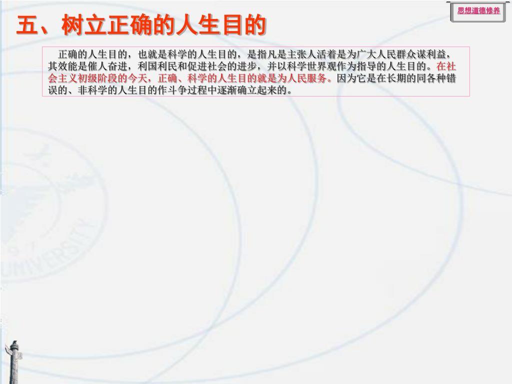 思想道德修养 五、树立正确的人生目的 正确的人生目的,也就是科学的人生目的,是指凡是主张人活着是为广大人民群众谋利益,其效能是催人奋进,利国利民和促进社会的进步,并以科学世界观作为指导的人生目的。在社会主义初级阶段的今天,正确、科学的人生目的就是为人民服务。因为它是在长期的同各种错误的、非科学的人生目的作斗争过程中逐渐确立起来的。