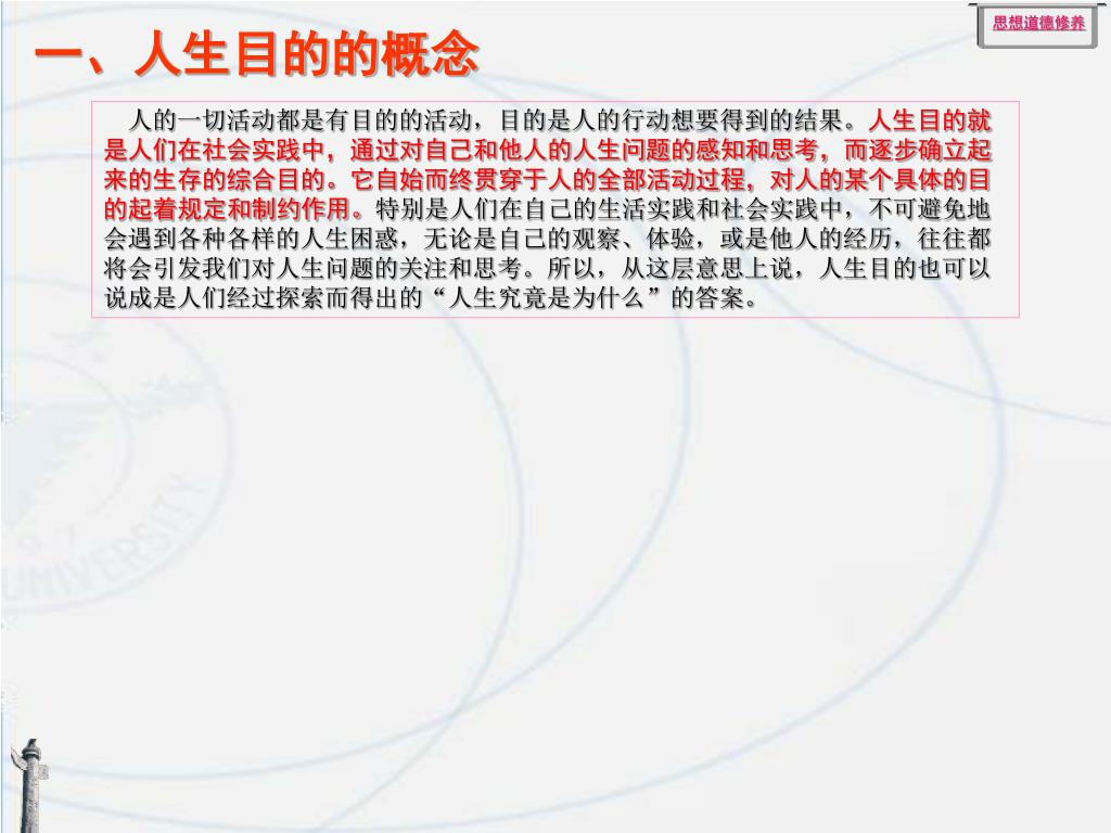 思想道德修养 第 五 章 树立正确人生目的认识人生根本问题 目的要求: 掌握人生目的的概念、作用,通过分析现实生活中各种典型的非科学人生目的论调,帮助青年大学生树立全心全意为人民服务的正确人生目的。 人生目的是一个人人生的根本问题,是人的人生观的核心。它直接决定着人生发展的根本方向,影响着人生的态度和人生价值的选择。是关系到“人为什么活着?”“人为谁而活着?”等人生具体问题的思考,由此,对一个人的人生而言,首先必须准确认识人生目的这一人生根本问题的全部内容,才能更好地树立起正确的人生目的。