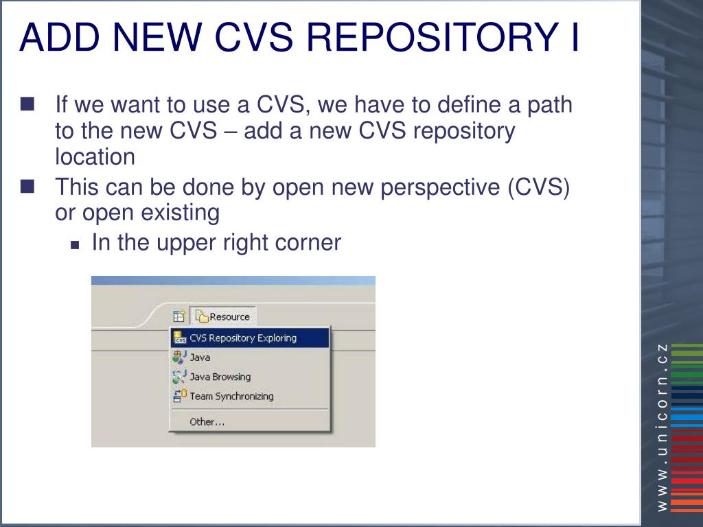 ADD NEW CVS REPOSITORY I • If we want to use a CVS, we have to define a path to the new CVS – add a new CVS repository location • This can be done by open new perspective (CVS) or open existing • In the upper right corner