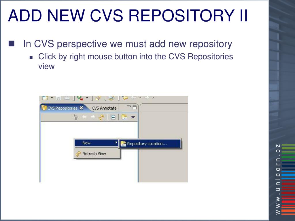 ADD NEW CVS REPOSITORY II • In CVS perspective we must add new repository • Click by right mouse button into the CVS Repositories view