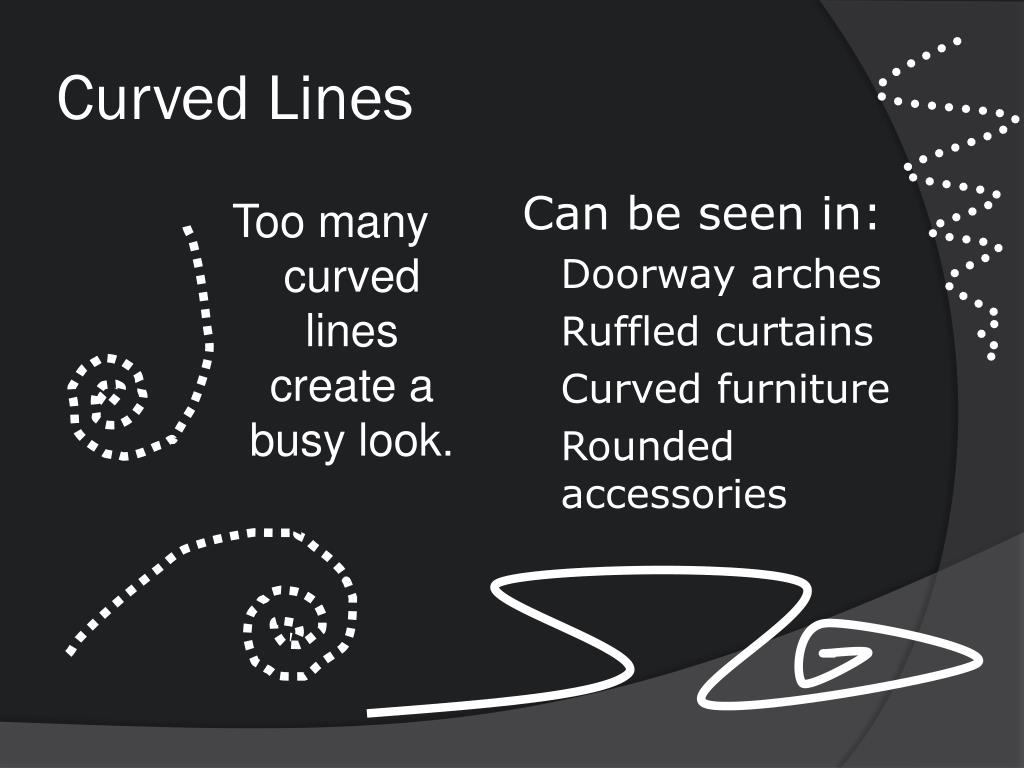 Curved Lines Too many curved lines create a busy look. Can be seen in: • Doorway arches • Ruffled curtains • Curved furniture • Rounded accessories