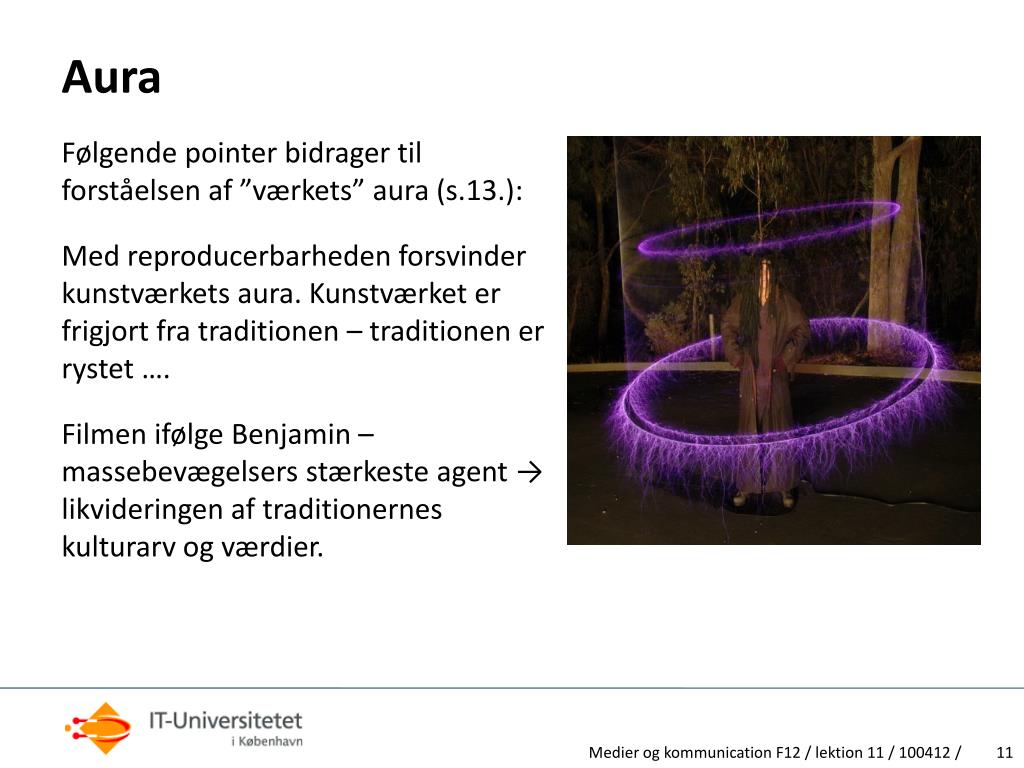 Aura Følgende pointer bidrager til forståelsen af ”værkets” aura (s.13.): Med reproducerbarheden forsvinder kunstværkets aura. Kunstværket er frigjort fra traditionen – traditionen er rystet …. Filmen ifølge Benjamin – massebevægelsers stærkeste agent → likvideringen af traditionernes kulturarv og værdier. Medier og kommunication F12 / lektion 11 / 100412 /