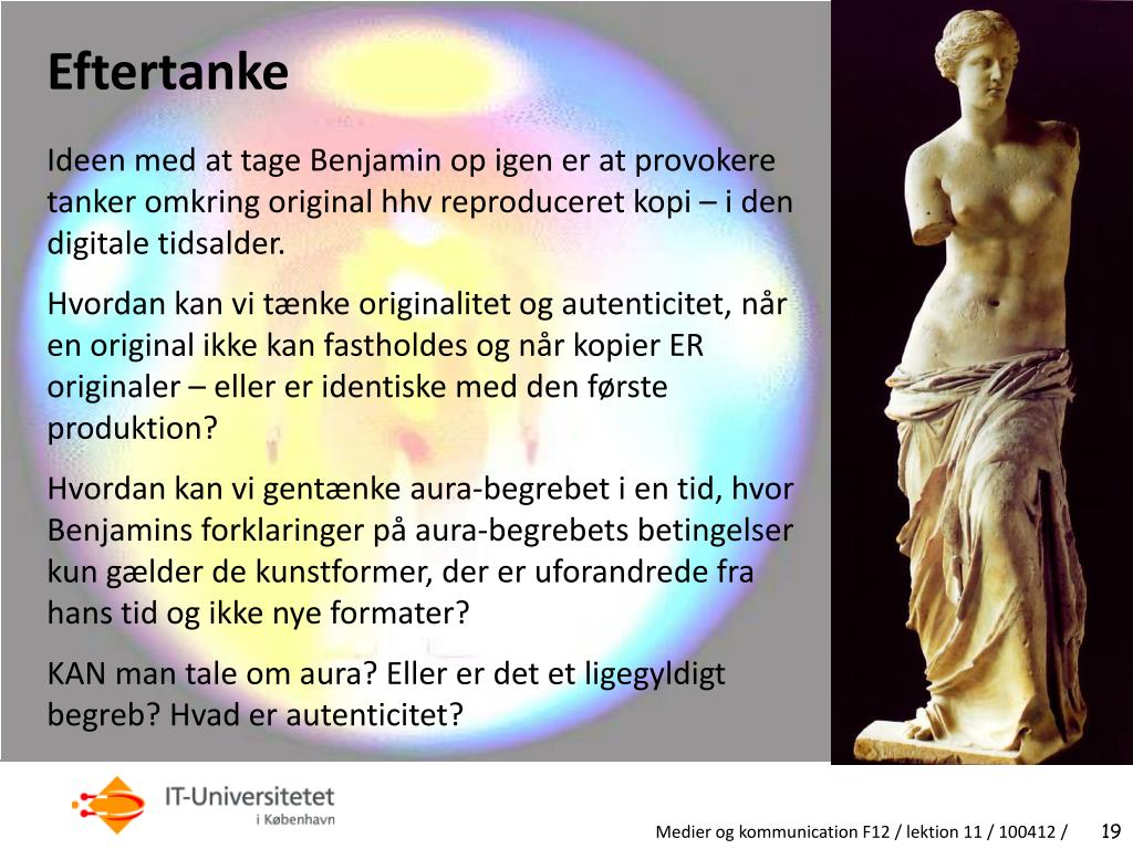 Eftertanke • Ideen med at tage Benjamin op igen er at provokere tanker omkring original hhv reproduceret kopi – i den digitale tidsalder. • Hvordan kan vi tænke originalitet og autenticitet, når en original ikke kan fastholdes og når kopier ER originaler – eller er identiske med den første produktion? • Hvordan kan vi gentænke aura-begrebet i en tid, hvor Benjamins forklaringer på aura-begrebets betingelser kun gælder de kunstformer, der er uforandrede fra hans tid og ikke nye formater? • KAN man tale om aura? Eller er det et ligegyldigt begreb? Hvad er autenticitet? Medier og kommunication F12 / lektion 11 / 100412 /