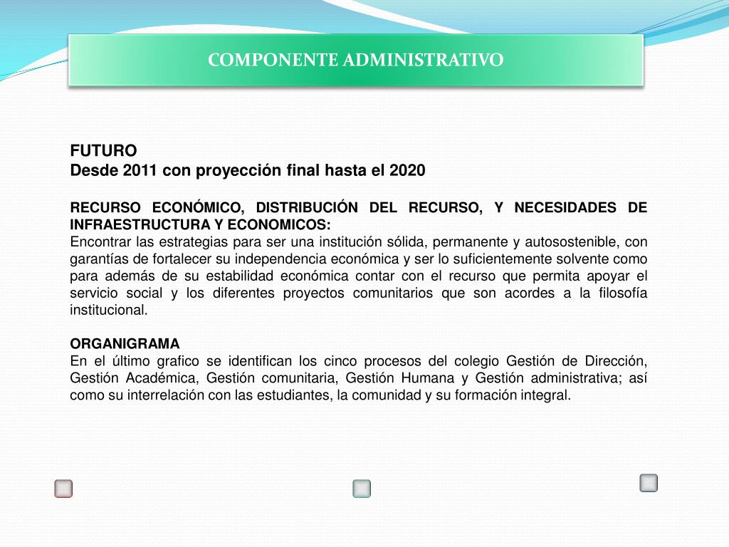 COMPONENTE ADMINISTRATIVO FUTURO Desde 2011 con proyección final hasta el 2020 RECURSO ECONÓMICO, DISTRIBUCIÓN DEL RECURSO, Y NECESIDADES DE INFRAESTRUCTURA Y ECONOMICOS: Encontrar las estrategias para ser una institución sólida, permanente y autosostenible, con garantías de fortalecer su independencia económica y ser lo suficientemente solvente como para además de su estabilidad económica contar con el recurso que permita apoyar el servicio social y los diferentes proyectos comunitarios que son acordes a la filosofía institucional. ORGANIGRAMA En el último grafico se identifican los cinco procesos del colegio Gestión de Dirección, Gestión Académica, Gestión comunitaria, Gestión Humana y Gestión administrativa; así como su interrelación con las estudiantes, la comunidad y su formación integral.