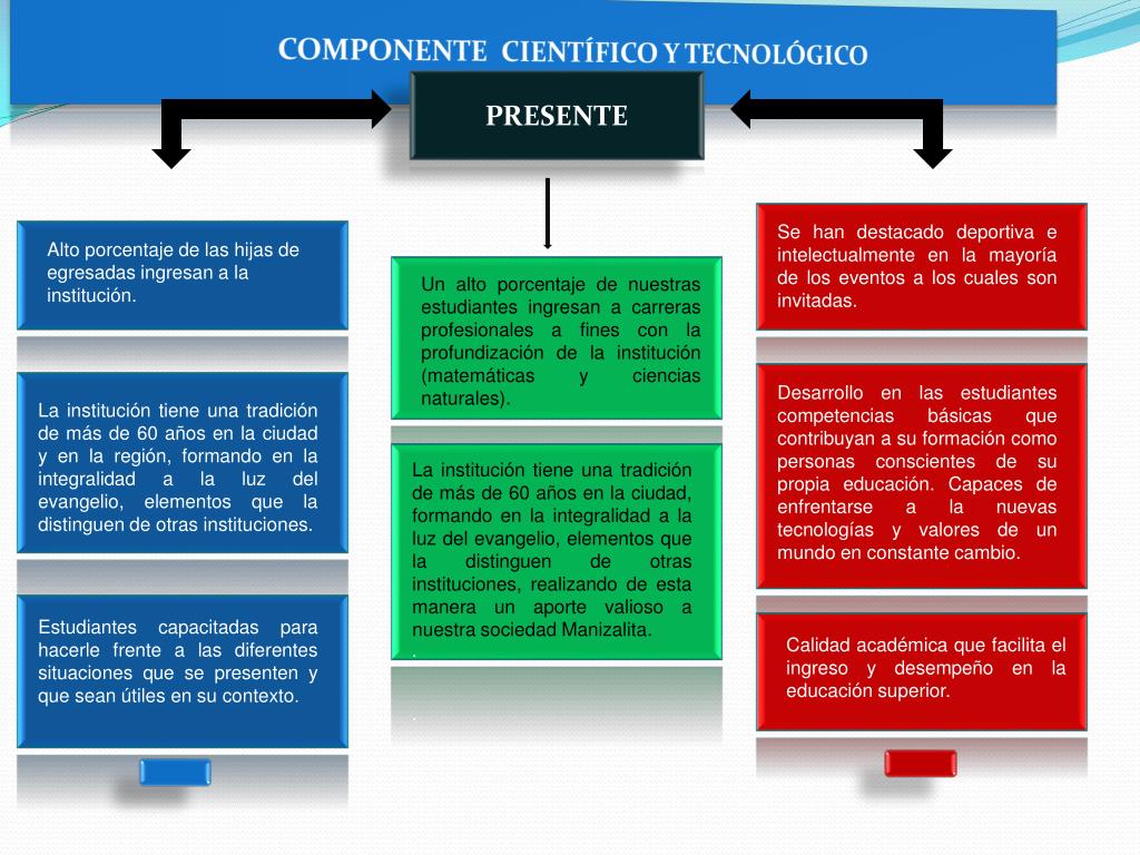 COMPONENTE CIENTÍFICO Y TECNOLÓGICO PRESENTE Se han destacado deportiva e intelectualmente en la mayoría de los eventos a los cuales son invitadas. Alto porcentaje de las hijas de egresadas ingresan a la institución. Un alto porcentaje de nuestras estudiantes ingresan a carreras profesionales a fines con la profundización de la institución (matemáticas y ciencias naturales). . Desarrollo en las estudiantes competencias básicas que contribuyan a su formación como personas conscientes de su propia educación. Capaces de enfrentarse a la nuevas tecnologías y valores de un mundo en constante cambio. La institución tiene una tradición de más de 60 años en la ciudad y en la región, formando en la integralidad a la luz del evangelio, elementos que la distinguen de otras instituciones. La institución tiene una tradición de más de 60 años en la ciudad, formando en la integralidad a la luz del evangelio, elementos que la distinguen de otras instituciones, realizando de esta manera un aporte valioso a nuestra sociedad Manizalita. . Estudiantes capacitadas para hacerle frente a las diferentes situaciones que se presenten y que sean útiles en su contexto. Calidad académica que facilita el ingreso y desempeño en la educación superior. .