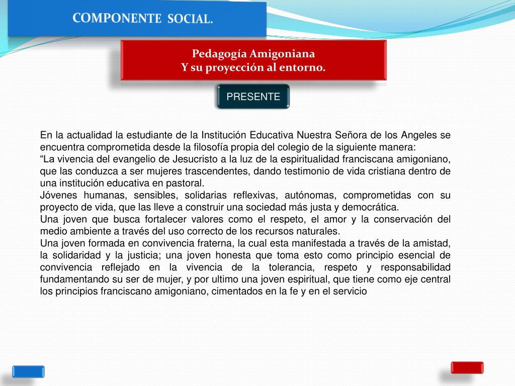 COMPONENTE SOCIAL. Pedagogía Amigoniana Y su proyección al entorno. FUTURO PASADO PRESENTE